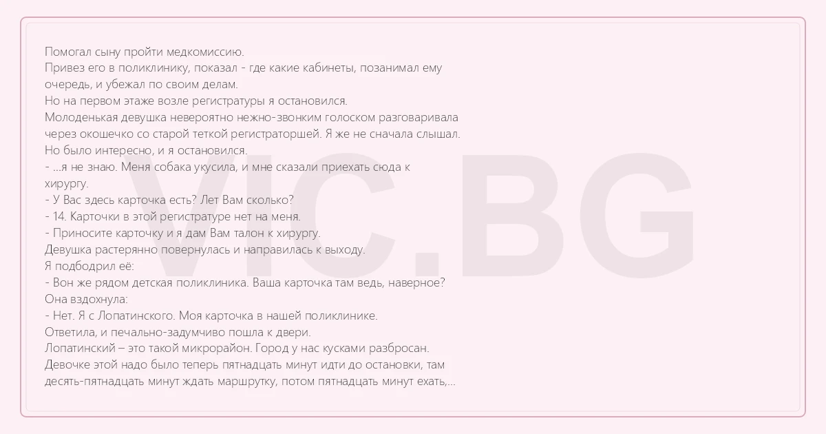 Помогал сыну пройти медкомиссию. Привез его в поликлинику, показал - где какие кабинеты, позанимал ему очередь, и убежал по своим делам. Но на первом этаже возле регистратуры я остановился. Молоденькая девушка невероятно нежно-звонким голоском разговаривала через окошечко со старой теткой регистраторшей. Я же не сначала слышал. Но было интересно, и я остановился. - …я не знаю. Меня собака укусила, и мне сказали приехать сюда к хирургу. - У Вас здесь карточка есть? Лет Вам сколько? - 14. Карточки в этой регистратуре нет на меня. - Приносите карточку и я дам Вам талон к хирургу. Девушка растерянно повернулась и направилась к выходу. Я подбодрил её: - Вон же рядом детская поликлиника. Ваша карточка там ведь, наверное? Она вздохнула: - Нет. Я с Лопатинского. Моя карточка в нашей поликлинике. Ответила, и печально-задумчиво пошла к двери. Лопатинский – это такой микрорайон. Город у нас кусками разбросан. Девочке этой надо было теперь пятнадцать минут идти до остановки, там десять-пятнадцать минут ждать маршрутку, потом пятнадцать минут ехать, еще десять минут идти до своей поликлиники, там в регистратуре просить карточку и возвращаться сюда. Не факт, что она еще и успела бы сегодня к врачу. Не! Ну, это же неправильно как-то! Несправедливо! Я тут же вспомнил, как сам многажды с травмами, без проблем и поисков карточки попадал к травматологу или хирургу, и повернулся к регистраторше: - А Вы разве не можете тут же на неё новую карточку завести? - Могу. А у неё есть документ какой-нибудь? (Прошу понять меня правильно – если бы на месте этой красавицы с мелодичным голосом, чудесным вздернутым носиком, стройной хрупкой фигуркой и великолепными густыми светлыми волосами, свободно раскинутыми по плечам и спускавшимися до середины лопаток, был бы нeгp преклонных годов, или ещё кто-то, то я поступил бы так же.) Я обрадовано крикнул: - Девушка! Вернитесь! У Вас паспорт есть с собой? Вы паспорт получили уже? Она подбежала: - Паспорта нет. Вот только страховой полис. Тетка в окошке, расправляя перед собой бланк, проворчала: - Давайте его сюда… ______ В тот вечер я приполз домой без сил после волейбола, и сказал младшему, сидящему за компом: - Алеш! Я сегодня человека спас! Рассказать? Алешка, не оборачиваясь, ответил: - Девчонку, что ли, в поликлинике? Не надо! Я знаю. Она сидела рядом в очереди к хирургу и всё кому-то рассказала по мобильнику. Говорит: «Хорошо, что рядом там какой-то мужчина оказался!» Я сразу понял, что это был ты…
