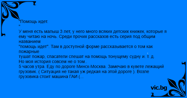 "Помощь идет. " У меня есть малыш 3 лет, у него много всяких детских книжек, которые я ему читаю на ночь. Среди прочих рассказов есть серия под общим названием "помощь идет". Там в доступной форме рассказывается о том как пожарные тушат пожар, спасатели спешат на помощь тонущему судну и. т. д. Но моя история совсем не о том.. 5 часов утра. Еду по дороге Минск-Москва. Замечаю в кувете лежащий грузовик. ( Ситуация не такая уж редкая на этой дороге ). Возле грузовика стоит машина ГАИ ( дело происходит на терр. Беларуси ). Вокруг грузовика ходит гаишник и что-то осматривает. Ладно. Еду дальше. Через полтора часа возвращаюсь назад той же дорогой. Вижу: тот же грузовик лежит в той же позе, та же машина ГАИ стоит на своем месте, тот же ГАИшник стоит возле машины и.... стреляет радаром. Помощь ПРИШЛА..