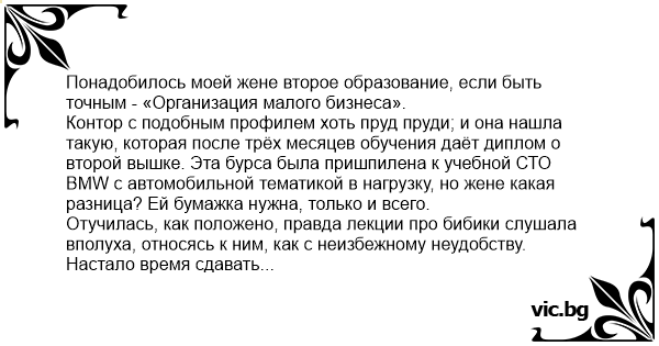 Контор с подобным профилем хоть пруд пруди; и она нашла такую, которая после трёх месяцев обучения даёт диплом о второй вышке. Эта бурса была пришпилена к учебной СТО BMW с автомобильной тематикой в нагрузку, но жене какая разница? Ей бумажка нужна, только и всего.