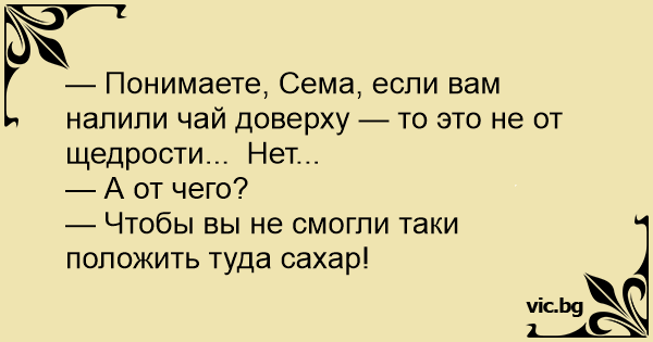 — Понимаете, Сема, если вам налили чай доверху — то это не от щедрости... Нет... — А от чего? — Чтобы вы не смогли таки положить туда сахар!