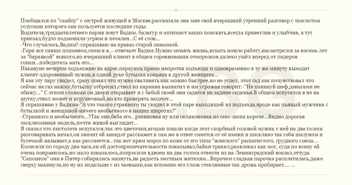 Пообщался по "скайпу" с сестрой живущей в Москве,рассказала она мне свой вчерашний утренний разговор с таксистом услугами которого она пользуется последние годы. Водителя,тридцатилетнего парня зовут Вадим, балагур и оптимист каких поискать,всегда приветлив и улыбчив, а тут приехал,будто подменили-угрюм и печален...С её слов... -Что случилось,Вадим?-спрашиваю на правах старой знакомой. -Гори все синим пламенем,спекся я...-отвечает Вадим.Нужно менять жизнь,искать новую работу,насмотрелся за восемь лет за "баранкой" всякого,но вчерашний клиент в общем соревновании отморозков далеко ушёл вперед от лидеров гонки...победитель мать его... Накануне вечером подъезжаю на адрес,паркуюсь прямо напротив подъезда и одновременно в ту же минуту выходит клиент-здоровенный мужик,в одной руке бутылка коньяка в другой женщина... Я как эту пару увидел, сразу понял что нужно сваливать как можно быстрее,но не успел, этот гад как почувствовал что сейчас на газ нажму,бутылку отбросил,ствол из кармана выхватил и им угрожая говорит:-"Не паникуй шеф,деньгами не обижу..." С этими словами он двери открывает и с бабой своей они садятся на задние сиденья.В общем испугался я не на шутку,ствол может и игрушечный,но кто проверять захочет... Я спрашиваю у Вадима-"А что такого странного ты увидел в этой паре выходящей из подъезда,вроде как пьяный мужчина с бутылкой и женщиной-ничего необычного в наших широтах?" -Странного и необычного...?Так она,баба его...резиновая ну или селиконовая,из cekc-шопа короче...Видно дорогая эксклюзивная модель,почти живой выглядит... Я сказал что пистолета испугался,так это цветочки,ягодки пошли когда этот скорбный головой мужик с ней на два голоса разговаривать начал,он значит ей анекдот расскажет и сам же в ответ смеется от её имени и пискляво так себя шалуном и бусечкой называет,а как рассмеется...так вот прям мороз по коже от его типа "женского" раскатистого, грудного смеха... Колесили по городу два часа,он ей достопримечательности показывал,байки травил,развлекал как мог, судя по всему ей очень понравилось,но мало показалось,попросили вдвоем на два голоса отвезти их на Ленинградский вокзал,оттуда "Сапсаном" они в Питер собирались махнуть,на радость местным жителям...Впрочем сладкая парочка расплатилась,даже сверху накинула,но ну их подальше с их чаевыми,как вспомню его глаза стеклянные так дрожь пробирает.... Сестра говорит что к окончанию истории она не выдержала,рассмеялась,представляя влюбленную пару которая нежно воркует в такси,смешно было так что остановится не могла.Вадим поначалу вроде обиделся,но потом они вместе пару начали обсуждать преимущества жизни с куклой и решили что мужик не такой уж и сумасшедший,плюсов хватает...Дальше они уже смеялись вместе,отсмеявшись Вадим снова посетовал на тяжелую и неказистую жизнь Московских таксистов,но сказал что пока не нашел работу получше то еще поколесит в поисках приключений...