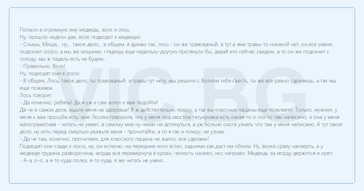 Попали в огромную яму медведь, волк и лось. Ну, прошло недели две, волк подходит к медведю: - Слышь, Миша,.. ну,.. такое дело,.. в общем, я думаю так, лось - он же травоядный, а тут в яме травы-то никакой нет, он все равно подохнет скоро, а мы же хищники, глядишь еще недельку-другую протянули бы, давай его сейчас съедим, а то он же подохнет с голоду, мы ж падаль есть не будем... - Правильно, Волк! Ну, подходят они к лосю: - В общем, Лось, такое дело, ты травоядный, а травы тут нету, мы решили с Волком тебя съесть, ты же все равно сдохнешь, а так мы еще поживем. Лось говорит: - Да конечно, ребяты! Да я уж и сам хотел к вам подойти! Да че в самом деле, ешьте меня на здоровье! Я ж действительно помру, а так вы классные пацаны еще поживете! Только, мужики, у меня к вам просьба есть: мне Лосиха говорила, что у меня под хвостом татуировка есть какая-то и что-то там написано, а она у меня малограмотная - читать не умеет, а самому мне ну никак не дотянуться, а уж больно охота узнать что там у меня написано. А тут такое дело, ну хоть перед смертью уважьте меня - прочитайте, а то я так и помру, не узнав. - Да че там, конечно, прочитаем, для классного пацана не жалко, все сделаем! Подходят они сзади к лосю, ну, он естесно, на передние ноги встал, задними как даст им обоим. Ну, волка сразу насмерть, а у медведя грудина разворочена, морда вся перевернута в крови, челюсть налево, нос направо. Медведь за морду держится и орет: - А-а, о-о, а я-то куда полез, я-то куда, я же читать не умею...