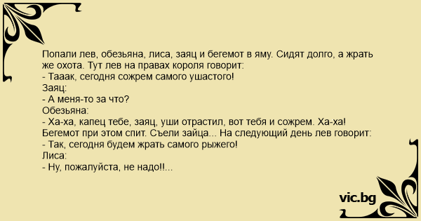 Попали лев, обезьяна, лиса, заяц и бегемот в яму. Сидят долго, а жрать же охота. Тут лев на правах короля говорит:
