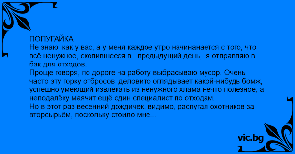 ПОПУГАЙКА Не знаю, как у вас, а у меня каждое утро начинанается с того, что всё ненужное, скопившееся в предыдущий день, я отправляю в бак для отходов.