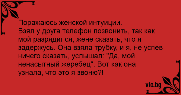 Взял у друга телефон позвонить, так как мой разрядился, жене сказать, что я задержусь. Она взяла трубку, и я, не успев ничего сказать, услышал: "Да, мой ненасытный жеребец". Вот как она узнала, что это я звоню?!