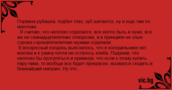 . Я считаю, что неплохо отделался, все могло быть и хуже, все же не семнадцатилетние отморозки, а в принципе не злые сорока-сорокапятилетние мужики отделали.