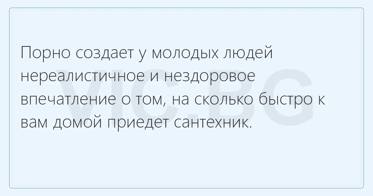 Пopнo создает у молодых людей нереалистичное и нездоровое впечатление о том, на сколько быстро к вам домой приедет сантехник.