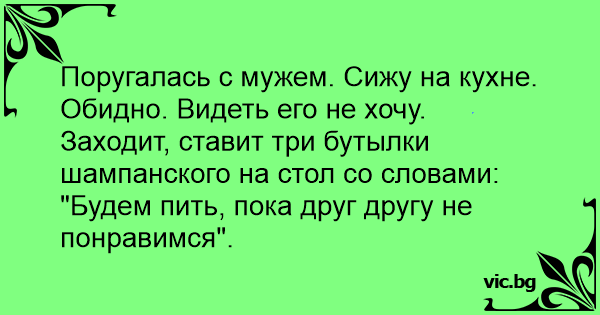 Поругалась с мужем. Сижу на кухне. Обидно. Видеть его не хочу. Заходит, ставит три бутылки шампанского на стол со словами: