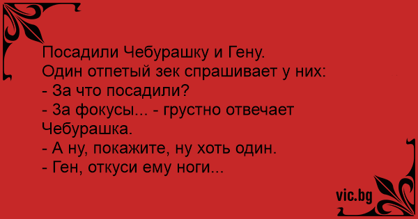 Седят в затвора крокодилът Гена и Чебурашка. Съкилийник ги пита: