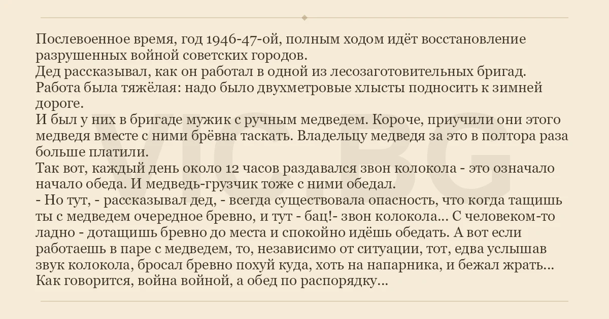 Послевоенное время, год 1946-47-ой, полным ходом идёт восстановление разрушенных войной советских городов. Дед рассказывал, как он работал в одной из лесозаготовительных бригад. Работа была тяжёлая: надо было двухметровые хлысты подносить к зимней дороге. И был у них в бригаде мужик с ручным медведем. Короче, приучили они этого медведя вместе с ними брёвна таскать. Владельцу медведя за это в полтора раза больше платили. Так вот, каждый день около 12 часов раздавался звон колокола - это означало начало обеда. И медведь-грузчик тоже с ними обедал. - Но тут, - рассказывал дед, - всегда существовала опасность, что когда тащишь ты с медведем очередное бревно, и тут - бац!- звон колокола... С человеком-то ладно - дотащишь бревно до места и спокойно идёшь обедать. А вот если работаешь в паре с медведем, то, независимо от ситуации, тот, едва услышав звук колокола, бросал бревно похуй куда, хоть на напарника, и бежал жрать... Как говорится, война войной, а обед по распорядку...