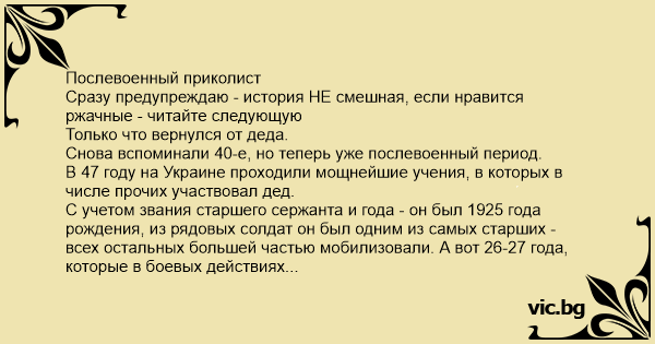 Послевоенный приколист Сразу предупреждаю - история НЕ смешная, если нравится ржачные - читайте следующую Только что вернулся от деда. Снова вспоминали 40-е, но теперь уже послевоенный период. В 47 году на Украине проходили мощнейшие учения, в которых в числе прочих участвовал дед. С учетом звания старшего сержанта и года - он был 1925 года рождения, из рядовых солдат он был одним из самых старших - всех остальных большей частью мобилизовали. А вот 26-27 года, которые в боевых действиях ВОВ участия не принимали, но службу во время войны проходили, составляли как раз костяк солдатской массы. В силу обстоятельств из пучки самолично дед не стрелял ни разу. Но получив должность наводчика на учениях, быстро изучил матчасть и во время импровизированного боя вел стрельбу холостыми снарядами. Помогали ему пара бойцов 26 года рождения. Фамилию приводить не буду- ну не мое это. Один из бойцов постоянно балагурил и шутил - просто, по доброму. С его прибаутками день пролетел незаметно. А после учений начали они со вторым помощником чистить пушку. Калибр маленький, ствол плохо видно. Почистили, посмотрели- что-то не то, какие-то шербинки что-ли... Ну, снова почистили. И опять щербинки. Позвали командира, тот посмотрел, потребовал снова почистить - но и на этот раз результат был один и тот же. Собралась целая комиссия- смотрели, рядили - сделали вывод, что в холостом снаряде на заводе сделали какой-то брак - что-то оторвалось от него, и ствол повредило. Что делать- орудие под списание. И тут наш балагур подходит - не было его во время чистки орудия. Спрашивает, что да как. Ну ему объясняют. Он подошел, посмотрел, и говорит: "На до же как оно вышло... я то и не думал! Хотел посмотреть , как гайка из ствола вылетит- не разу же не стрелял из пушки то!" С дурака неча взять, но можно дать. Так наш хлопец червонец и схлопотал - может, лес валил, а может и золотишко мыл в Магадане. Верно говорят - слово -серебро, молчание- золото.