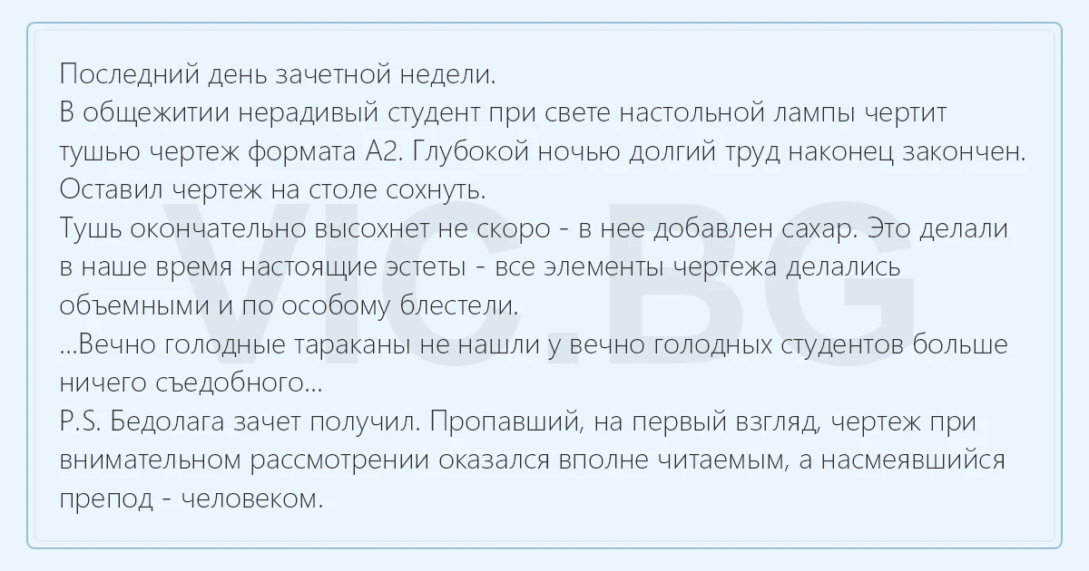 P.S. Бедолага зачет получил. Пропавший, на первый взгляд, чертеж при внимательном рассмотрении оказался вполне читаемым, а насмеявшийся препод - человеком.