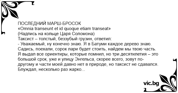 ПОСЛЕДНИЙ МАРШ-БРОСОК «Omnia transeunt et id quoque etiam transeat» (Надпись на кольце Царя Соломона) Таксист – толстый, беззубый грузин, ответил: