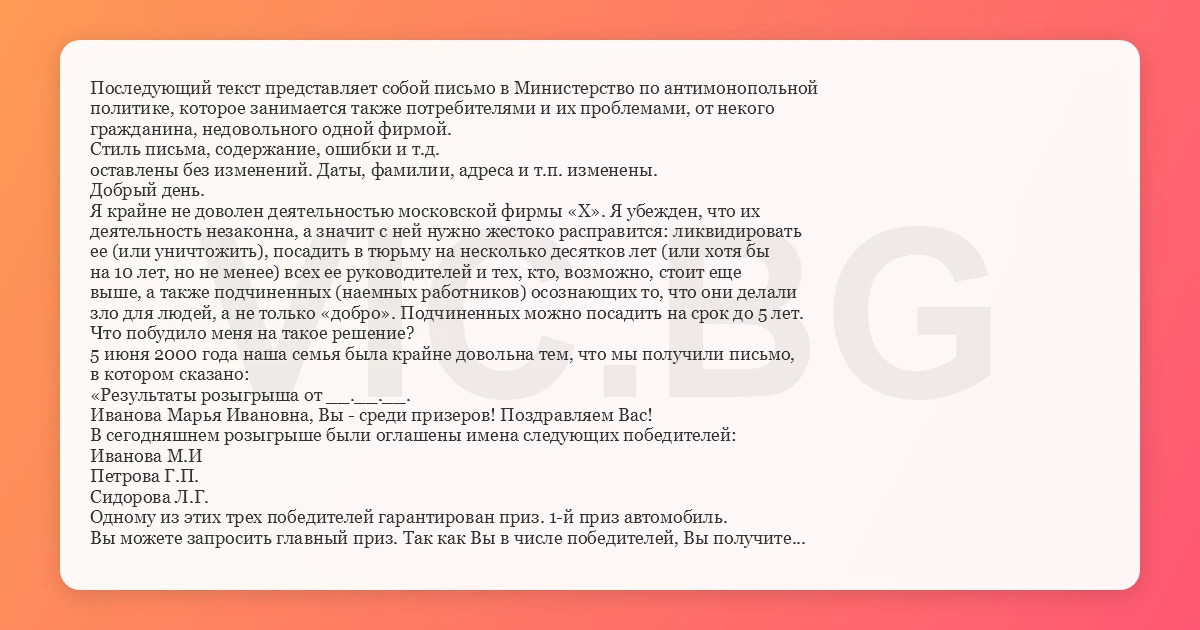 Последующий текст представляет собой письмо в Министерство по антимонопольной политике, которое занимается также потребителями и их проблемами, от некого гражданина, недовольного одной фирмой. Стиль письма, содержание, ошибки и т.д. оставлены без изменений. Даты, фамилии, адреса и т.п. изменены. Добрый день. Я крайне не доволен деятельностью московской фирмы «Х». Я убежден, что их деятельность незаконна, а значит с ней нужно жестоко расправится: ликвидировать ее (или уничтожить), посадить в тюрьму на несколько десятков лет (или хотя бы на 10 лет, но не менее) всех ее руководителей и тех, кто, возможно, стоит еще выше, а также подчиненных (наемных работников) осознающих то, что они делали зло для людей, а не только «добро». Подчиненных можно посадить на срок до 5 лет. Что побудило меня на такое решение? 5 июня 2000 года наша семья была крайне довольна тем, что мы получили письмо, в котором сказано: «Результаты розыгрыша от __.__.__. Иванова Марья Ивановна, Вы - среди призеров! Поздравляем Вас! В сегодняшнем розыгрыше были оглашены имена следующих победителей: Иванова М.И Петрова Г.П. Сидорова Л.Г. Одному из этих трех победителей гарантирован приз. 1-й приз автомобиль. Вы можете запросить главный приз. Так как Вы в числе победителей, Вы получите приз так быстро, как это возможно. Вышлите уже сегодня Ваш Запрос приза с заказом не менее двух наименований товара из прилагаемого каталога и запросите Ваш приз. Вы имеете на это право!» Я как и любой другой гражданин РФ (99,9% из 100%) естественно поверил фирме «Х» и выслал необходимый «запрос», чтобы получить приз, который мы выиграли, запрос с двумя заказанными товарами. Товары нам прислали: надувную лодку и ботинки. О надувной лодке: производитель неизвестен, полной инструкции нет, а есть лишь небольшая инструкция примерно из 10 коротких строк - «отмазка». Инструкция дает менее 10% информации, которую следует получить при пользовании лодкой. На следующий же день я решил поплавать на лодке, заплыл на середину широкой реки, но по согласованию с инструкцией по ширине водоема, далее у меня сломалось пополам весло и затонуло. Одним веслом очень трудно было доплыть до берега, лодка была легкая резиновая и она крутилась на одном месте, так, что я доплыл до берега, заросшего травой, с помощью рук (ладоней). Вылез на берег и в водяной траве ногу сильно разрезал стеклом от разбитых бутылок в двух местах (раны были длинными и глубокими), потерял много крови, после добрался до дому (в 6 км от реки). Потом я вынужден был ехать в город в травматологию потом я 3 недели дома ходил на одной ноге. Вот такая история с лодкой и мной. Кстати, когда нам прислали товары, то информации по поводу нашего выигранного приза было «0», т.е. они нас посмели игнорировать. После того, как с ногой стало все в порядке я звонил к ним с двумя интересующими меня вопросами: 1) получить информацию о том выиграли мы приз или невыиграли; 2) могут ли нам выслать весло (лодка не прослужила и дня). По первому вопросу я звонил по одному телефону - и с дикостью бросали трубку, ссылаясь на то, что они не имеют право давать такую информацию. А для чего тогда эти телефоны? Как я - житель Тюмени могу с ними связаться по другому? По второму вопросу я звонил по другому телефону. Позвонил, там взяли трубку, я задал вопрос, мне сказали «Подожди, щас позову к телефону, кого надо». Прошло одна ми