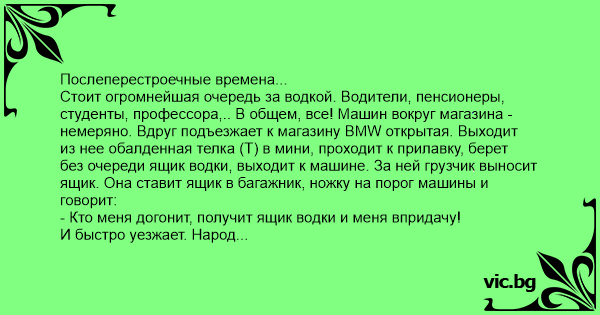 Стоит огpомнейшая очеpедь за водкой. Водители, пенсионеpы,