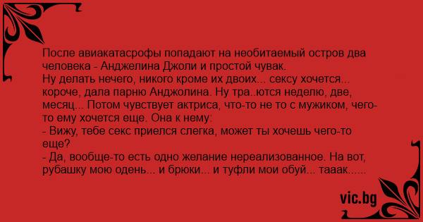 Ну делать нечего, никого кроме их двоих... сексу хочется... короче, дала парню Анджолина. Ну тра..ются неделю, две, месяц... Потом чувствует актриса, что-то не то с мужиком, чего-то ему хочется еще. Она к нему: