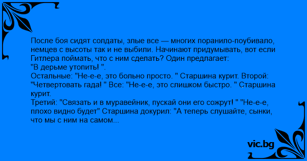 После боя сидят солдаты, злые все — многих поранило-поубивало, немцев с высоты так и не выбили. Начинают придумывать, вот если Гитлера поймать, что с ним сделать? Один предлагает: