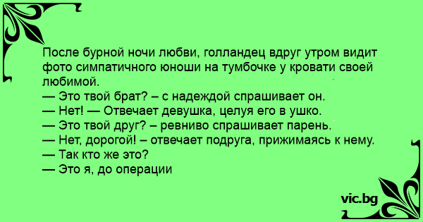 После бурной ночи любви, голландец вдруг утром видит фото симпатичного юноши на тумбочке у кровати своей любимой.