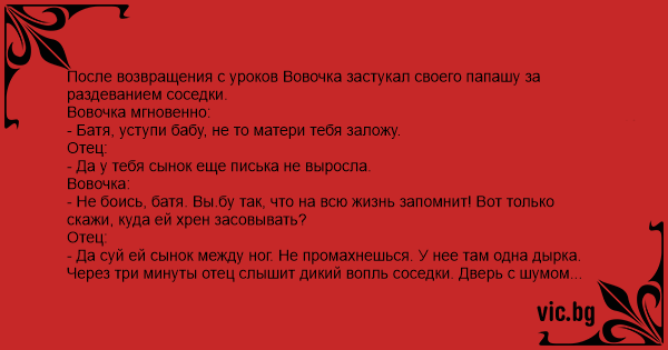 Через три минуты отец слышит дикий вопль соседки. Дверь с шумом распахивается, та выбегает голая, глаза на лоб лезут, вся в крови перемазана..