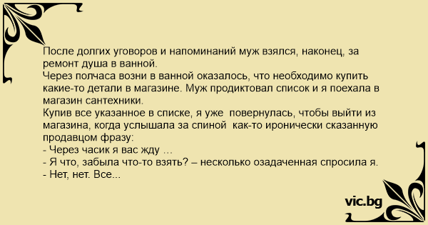 - Нет, нет. Все нормально. Только, я знаю по опыту, что если хозяин сам берется ремонтировать что-то из сантехники, его жене минимум трижды приходится сюда прибегать чего-то докупать.