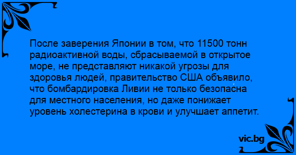 После заверения Японии в том, что 11500 тонн радиоактивной воды, сбрасываемой в открытое море, не представляют никакой угрозы для здоровья людей, правительство США объявило, что бомбардировка Ливии не только безопасна для местного населения, но даже понижает уровень холестерина в крови и улучшает аппетит.