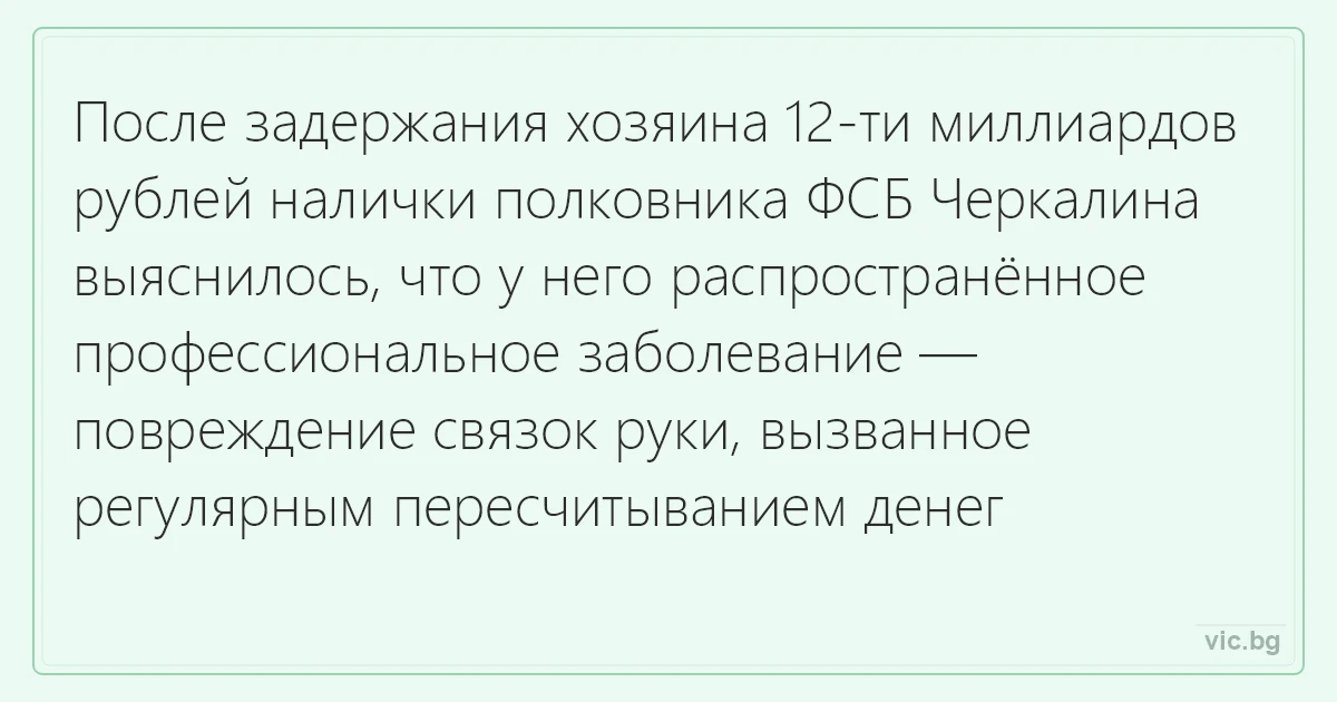 После задержания хозяина 12-ти миллиардов рублей налички полковника ФСБ Черкалина выяснилось, что у него распространённое профессиональное заболевание — повреждение связок руки, вызванное регулярным пересчитыванием денег