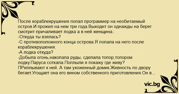 После кораблекрушения попал программер на необитаемый остров.И прожил на нем три года.Выходит он однажды на берег смотрит причаливает лодка а в ней женщина.: