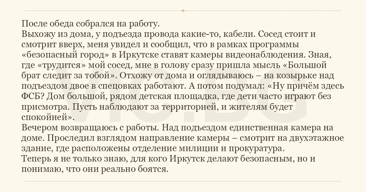 После обеда собрался на работу. Выхожу из дома, у подъезда провода какие-то, кабели. Сосед стоит и смотрит вверх, меня увидел и сообщил, что в рамках программы «безопасный город» в Иркутске ставят камеры видеонаблюдения. Зная, где «трудится» мой сосед, мне в голову сразу пришла мысль «Большой брат следит за тобой». Отхожу от дома и оглядываюсь – на козырьке над подъездом двое в спецовках работают. А потом подумал: «Ну причём здесь ФСБ? Дом большой, рядом детская площадка, где дети часто играют без присмотра. Пусть наблюдают за территорией, и жителям будет спокойней». Вечером возвращаюсь с работы. Над подъездом единственная камера на доме. Проследил взглядом направление камеры – смотрит на двухэтажное здание, где расположены отделение милиции и прокуратура. Теперь я не только знаю, для кого Иркутск делают безопасным, но и понимаю, что они реально боятся.