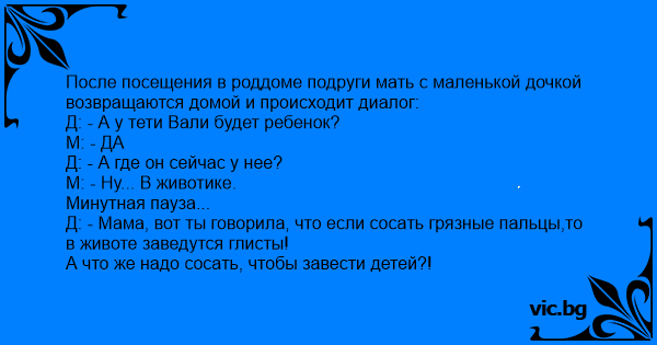 Д: - Мама, вот ты говорила, что если cоcaть грязные пальцы,то в животе заведутся глисты!
