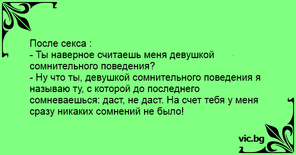 После cekca :<br />- Ты наверное считаешь меня девушкой сомнительного поведения?<br />- Ну что ты, девушкой сомнительного поведения я называю ту, с которой до последнего сомневаешься: даст, не даст. На счет тебя у меня сразу никаких сомнений не было!