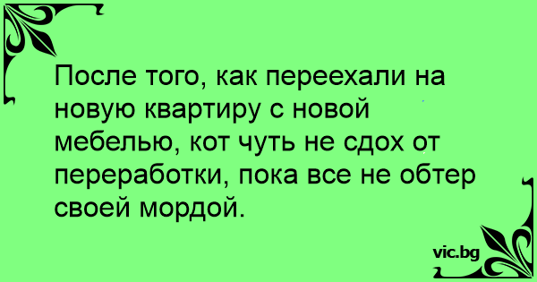 После того, как переехали на новую квартиру с новой мебелью, кот чуть не сдох от переработки, пока все не обтер своей мордой.