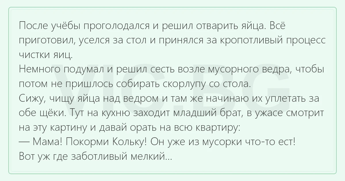 После учёбы проголодался и решил отварить яйца. Всё приготовил, уселся за стол и принялся за кропотливый процесс чистки яиц. Немного подумал и решил сесть возле мусорного ведра, чтобы потом не пришлось собирать скорлупу со стола. Сижу, чищу яйца над ведром и там же начинаю их уплетать за обе щёки. Тут на кухню заходит младший брат, в ужасе смотрит на эту картину и давай орать на всю квартиру: — Мама! Покорми Кольку! Он уже из мусорки что-то ест! Вот уж где заботливый мелкий…