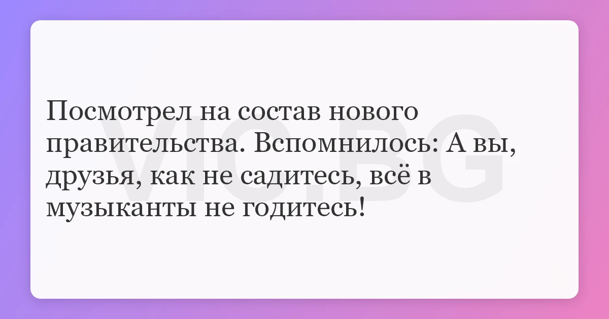 Посмотрел на состав нового правительства. Вспомнилось: А вы, друзья, как не садитесь, всё в музыканты не годитесь!