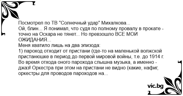 Посмотрел по ТВ "Солнечный удар" Михалкова... Ой, блин... Я понимал, что судя по полному провалу в прокате - точно на Оскара не тянет... Но превзошло ВСЕ МОИ ОЖИДАНИЯ... Меня хватило лишь на два эпизода: 1) пароход отходит от пристани (где-то на маленькой волжской пристанюшке в период до первой мировой войны, т.е. до 1914 г. Во время отхода оного парохода слышна музыка, а именно - джаз! Оркестра при этом на пристани не видно (какие, нафиг, оркестры для проводов пароходов на микроскопической пристанюшке в поволжском городке с населением максимум 500 чел? за чей счет банкет?) Вариантов остается два: либо это был граммофон (но не показывали его, да и звук был чистый, "не граммофонный"), либо с помощью машины времени в 1913 год из какого-нибудь 1963 года перенеслась ламповая радиотрансляционная установка. Последнее - наиболее вероятно. Насчет джаза в России в 1913 году, цитата: "Днем рождения отечественного джаза традиционно считается 1 октября 1922 года, когда в России состоялся первый в стране джазовый концерт". Даже в США, на родине джаза, само слово джаз начало употребляться в отношении музыки только в 1915 г (!) Какой же тогда джаз (мелодия в стиле Цфасмана, кстати, т.е. минимум 1930-е годы по стилю), льющийся из ушей героев фильма на пристани в уездном городе N в 1913 г. в Российской империи? 2) толпа мордатых артистов, страдающих поголовно ожирением II степени, изображающих "боевых белых офицеров" в плену у красных (если посмотреть на фото Колчака - только на именно фото САМОГО худющего Колчака, а не более чем увесистого Хабенского в роли Колчака - можно легко представить, как выглядело большинство офицеров в то время). Они хотят зачем-то сфотографироваться (в плену!). Один из офицеров объявляет "у меня есть новый фотоаппарат, давайте сфотографируемся!". Я подумал было про пленочный "Кодак" (уже был тогда), хотя в красном плену(!) проявлять пленку, печатать фотографии - бред какой! Но фантазия мэтра российской кинематографии пошла дальше, этот офицер в красный плен потащил, как оказалось, новый (со слов героя) ПЛАСТИНОЧНЫЙ фотоаппарат, размер пластинок где-то минимум 13 на 18 см. На всякий случай, вес такого деревянного агрегата - килограммов 20. И эту бандуру (со стеклянными пластинками, проявителями, фотобумагой, и т.п., т.е. еще килограммов 10) офицер попер с собой в плен к красным? Как (неужели он в плен сдавался с личным автомобилем)? И, главное, нах..я? Дай ответ, Никита Сергеич! Не дает ответа... Больше не смог смотреть - очередная даже не "развесистая клюква", а развешиваемая на уши с непонятной целью откровеннейшая лапша.
