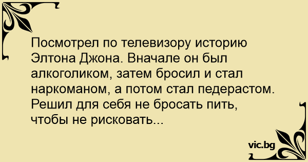 Посмотрел по телевизору историю Элтона Джона. Вначале он был алкоголиком, затем бросил и стал наркоманом, а потом стал педерастом.