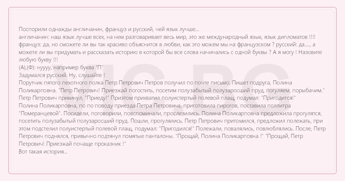 англичанин: наш язык лучше всех, на нем разговаривает весь мир, это же международный язык, язык дипломатов !!!! француз: да, но сможете ли вы так красиво объяснится в любви, как это можем мы на французском ? русский: да...., а можете ли вы придумать и рассказать историю в которой бы все слова начинались с одной буквы ? А я могу ! Назовите любую букву !!!