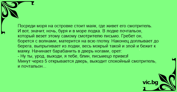 Минут через 5 открывается дверь, выходит спокойный смотритель, и почтальон обрушивает на него всю свою ярость. Мол, живут тут козлы за сто километров, ты греби тут, блин, жизнью рискуй, потом под дверьми жди, и вообще. В общем матерится на него минут пять. Смотритель внимательно слушает, наконец ему это надоедает и он перебивает: