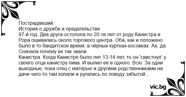 P.S. Практически всем, кому эту историю рассказываю, задаю одни и те же вопросы: «Жалко ли Вам пострадавшего? И почему?» Слышу стереотипные ответы вида: «Да жалко. Ведь он пострадал за дружбу».