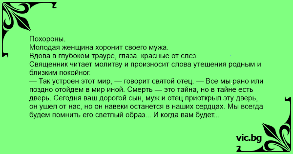 Похороны. Молодая женщина хоронит своего мужа. Вдова в глубоком трауре, глаза, красные от слез. Священник читает молитву и произносит слова утешения родным и близким покойног. — Так устроен этот мир, — говорит святой отец. — Все мы рано или поздно отойдем в мир иной. Смерть — это тайна, но в тайне есть дверь. Сегодня ваш дорогой сын, муж и отец приоткрыл эту дверь, он ушел от нас, но он навеки останется в наших сердцах. Мы всегда будем помнить его светлый образ... И когда вам будет особенно тяжело... (обращается к молодой вдове) вспоминайте, как любили этого человека, как тепло и радостно вам было рядом с ним. Вспоминайте его лицо, его руки, его последние слова... Вы помните его последние слова? — Да, святой отец. — И что же он сказал? — Из этого ружья, корова, ты даже в слона не попадешь!