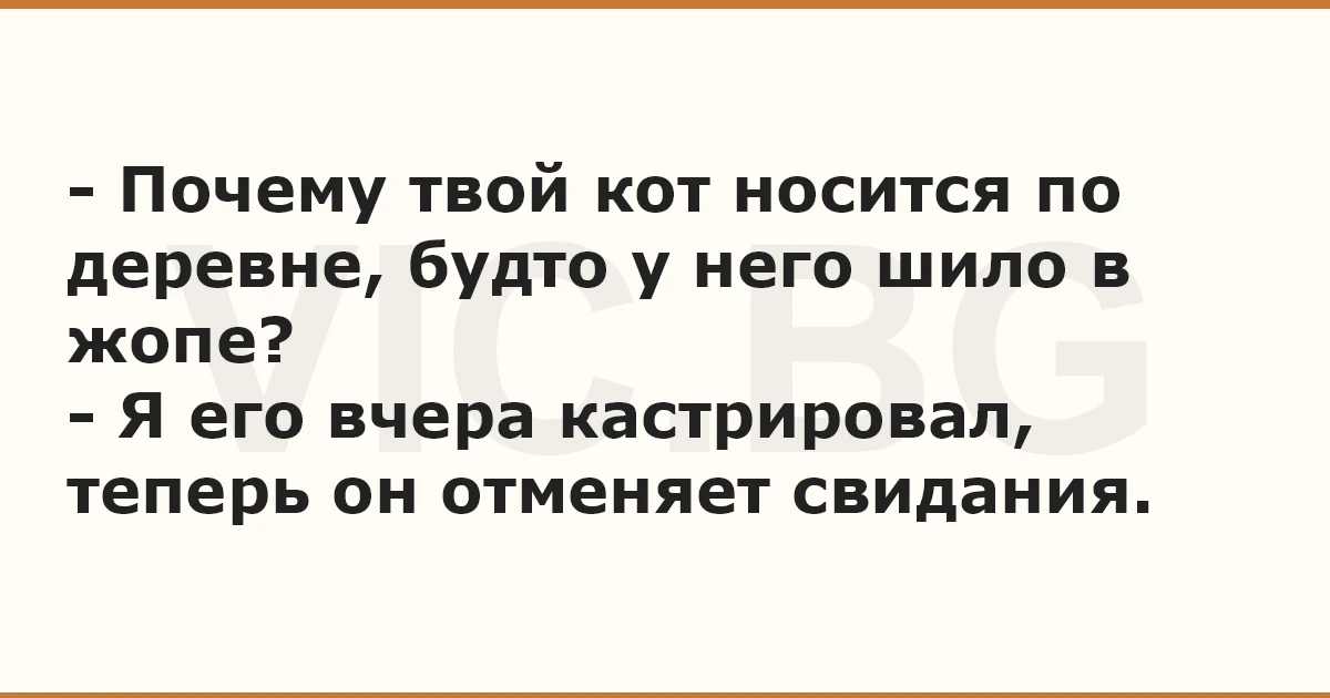 - Почему твой кот носится по деревне, будто у него шило в жопе? - Я его вчера кастрировал, теперь он отменяет свидания.