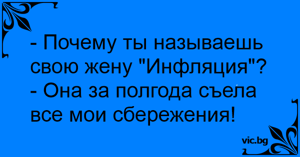 - Защо наричаш жена си "Инфлация"?! - Ами за половин година ми глътна спестяванията ...