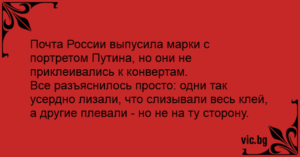 В Ерефії випустили марку з портретом Путіна. Але ніхто так і не зміг її приклеїти. 14% плювали не на той бік, 86% лизали не з того боку.