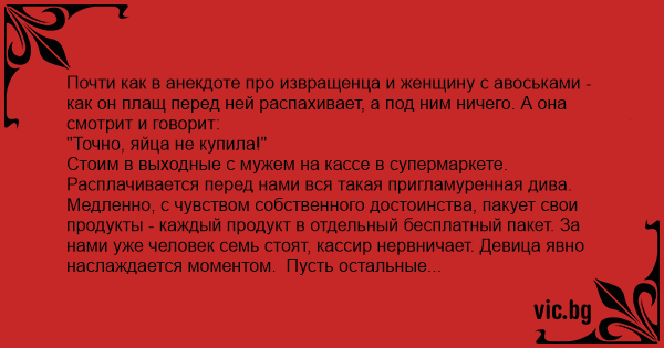 Почти как в анекдоте про извращенца и женщину с авоськами - как он плащ перед ней распахивает, а под ним ничего. А она смотрит и говорит: