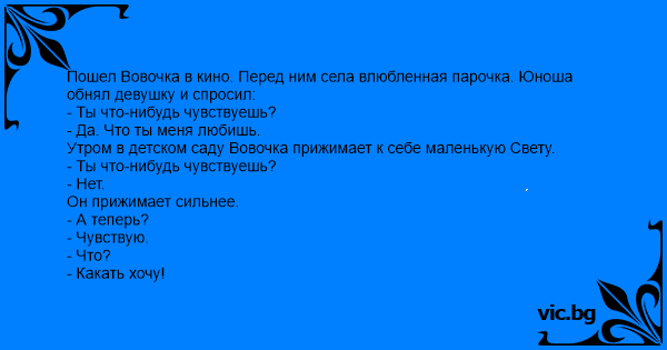 Пошел Вовочка в кино. Перед ним села влюбленная парочка. Юноша обнял девушку и спросил: