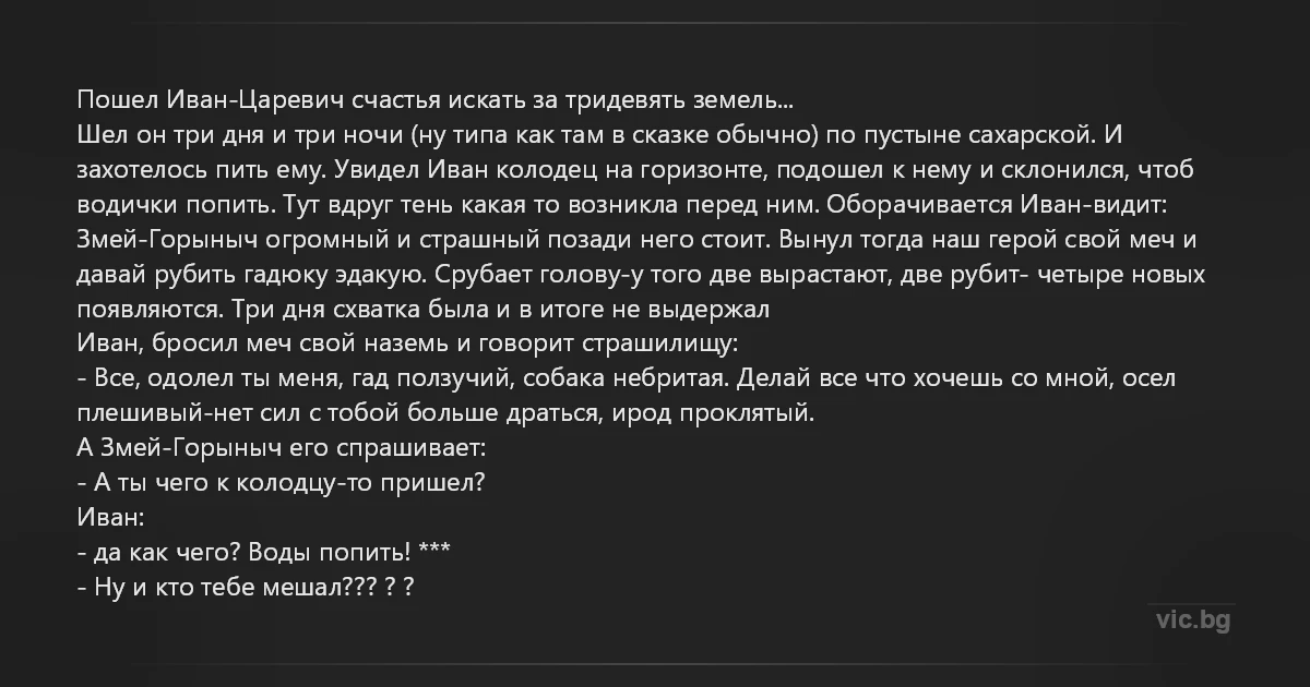 Пошел Иван-Царевич счастья искать за тридевять земель... Шел он три дня и три ночи (ну типа как там в сказке обычно) по пустыне сахарской. И захотелось пить ему. Увидел Иван колодец на горизонте, подошел к нему и склонился, чтоб водички попить. Тут вдруг тень какая то возникла перед ним. Оборачивается Иван-видит: Змей-Горыныч огромный и страшный позади него стоит. Вынул тогда наш герой свой меч и давай рубить гадюку эдакую. Срубает голову-у того две вырастают, две рубит- четыре новых появляются. Три дня схватка была и в итоге не выдержал Иван, бросил меч свой наземь и говорит страшилищу: - Все, одолел ты меня, гад ползучий, собака небритая. Делай все что хочешь со мной, осел плешивый-нет сил с тобой больше драться, ирод проклятый. А Змей-Горыныч его спрашивает: - А ты чего к колодцу-то пришел? Иван: - да как чего? Воды попить! *** - Ну и кто тебе мешал??? ? ?