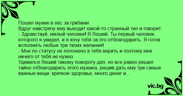 Удивился Леший такому повороту дел, но все равно решил тайно отблагодарить этого мужика, решив дать ему три самые важные вещи: крепкое здоровье, много денег и насыщенную половую жизнь.