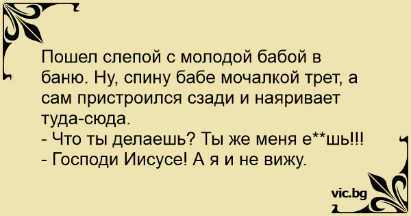Пошел слепой с молодой бабой в баню. Ну, спину бабе мочалкой трет, а сам пристроился сзади и наяривает туда-сюда.