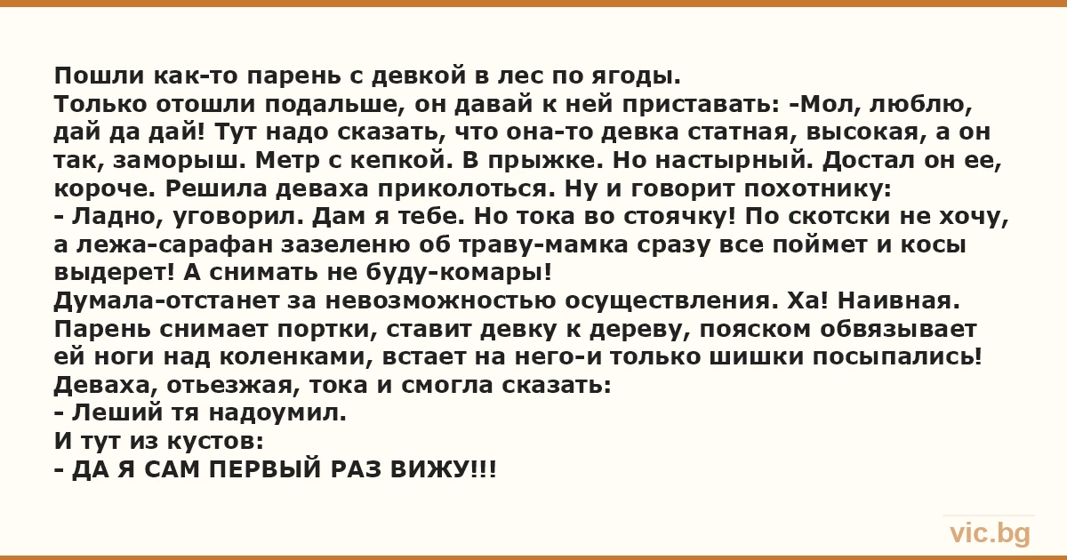 Пошли как-то парень с девкой в лес по ягоды. Только отошли подальше, он давай к ней приставать: -Мол, люблю, дай да дай! Тут надо сказать, что она-то девка статная, высокая, а он так, заморыш. Метр с кепкой. В прыжке. Но настырный. Достал он ее, короче. Решила деваха приколоться. Ну и говорит похотнику: - Ладно, уговорил. Дам я тебе. Но тока во стоячку! По скотски не хочу, а лежа-сарафан зазеленю об траву-мамка сразу все поймет и косы выдерет! А снимать не буду-комары! Думала-отстанет за невозможностью осуществления. Ха! Наивная. Парень снимает портки, ставит девку к дереву, пояском обвязывает ей ноги над коленками, встает на него-и только шишки посыпались! Деваха, отьезжая, тока и смогла сказать: - Леший тя надоумил. И тут из кустов: - ДА Я САМ ПЕРВЫЙ РАЗ ВИЖУ!!!
