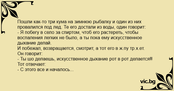 Пошли как-то три кума на зимнюю рыбалку и один из них провалился под лед. Те его достали из воды, один говорит: