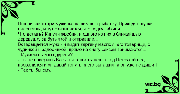 Пошли как то три мужичка на зимнюю рыбалку. Приходят, лунки надолбили, и тут оказывается, что водку забыли. Что делать? Кинули жребий, и одного из них в ближайшую деревушку за бутылкой и отправили... Возвращается мужик и видит картину маслом, его товарищи, с чудинкой и задоринкой, прямо на снегу сексом занимаются... - Мужики вы что сдурели?; - Ты не поверишь Вась, ты только ушел, а под Петрухой лед провалился и он давай тонуть, я его вытащил, а он уже не дышит! - Так ты бы ему искусственное дыхание лучше сделал!!! - Ты не поверишь Вась, с этого все и началось!!!